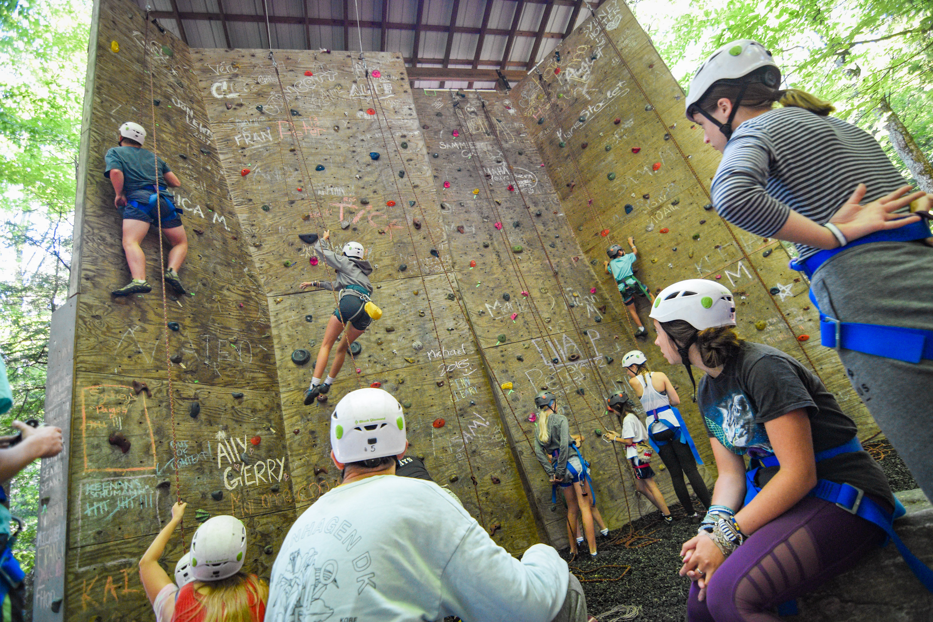 Our rock-climbing program includes the in-camp climbing wall, bouldering, and occasionally assisting with out-of-camp rock climbing trips. We require instructors who can run this activity safely. Instructors must have a competent knowledge of rope systems, knots, and safety procedures. We offer comprehensive on-site training of our set-up here by a PCIA instructor, but having a high-level knowledge of climbing beforehand is essential.